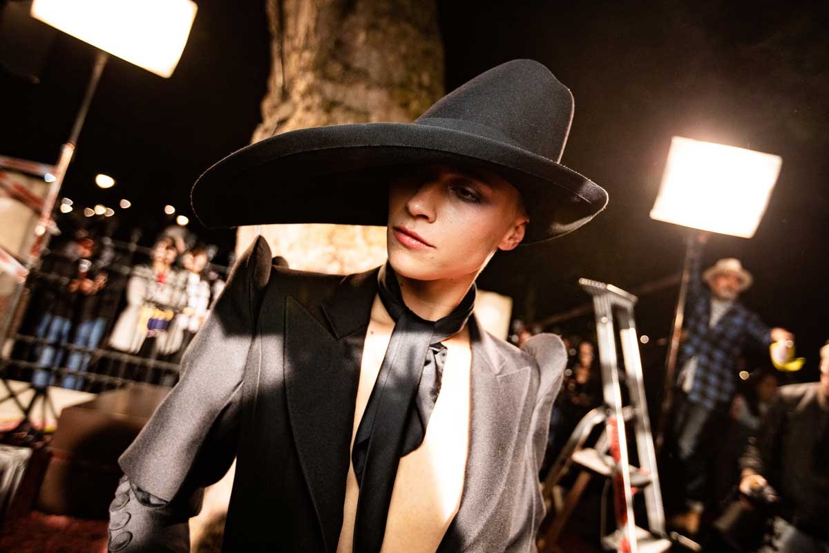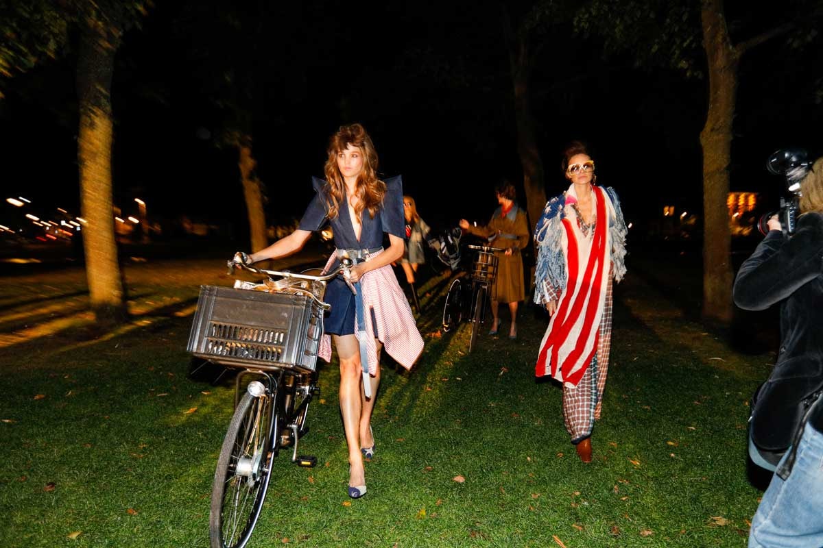 En vélo ou à l’arrière d’une vieille décapotable, l'arrivée des mannequins fait partie du show. Chacun a sa place et finit par créer un tableau vivant sous les applaudissements du public. Ronald van der Kemp salue enfin, dans une veste en cuir caractéristique de son style.