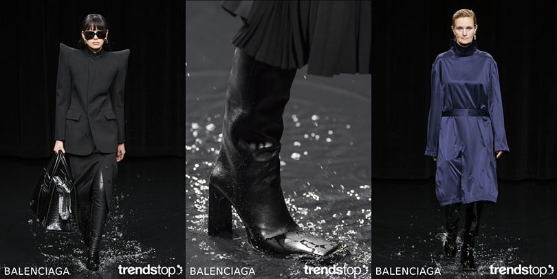 Demna Gvasalia a mis la question de la crise climatique au premier plan de sa collection, avec un podium inondé et un front row qui a obligé les spectateurs à regarder de loin. Sur un fond d'écran LED, une vision apocalyptique de l'avenir de notre planète s'affichait, tandis que des mannequins en cuir noir futuriste, robes de prêtres et maillots de football de marque défilaient sur le podium. Des épaulettes exagérées et des accessoires surdimensionnés bouleversaient la tendance.