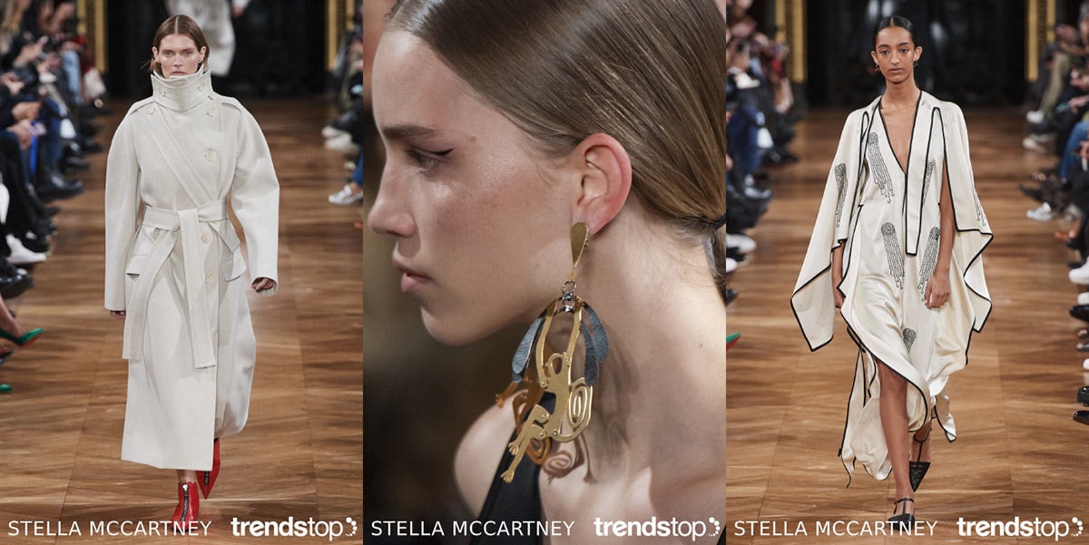 Stella McCartney, qui est une figure de proue de l'industrie en matière de durabilité, a encouragé son public à contribuer à la compensation du dioxyde de carbone du défilé en offrant des jeunes arbres dans des sacs en papier personnalisés. Sa collection de pyjamas et de kaftans décontractés, accentués par des bijoux sur le thème des animaux sauvages, a été réalisée en collaboration avec Erte, en utilisant les archives de l'illustratrice pour produire un motif de méduse qui met en évidence l'engagement de la créatrice en faveur de la conservation.