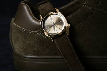 La nuance du daim des baskets fait référence au bracelet de la montre March La.b. Les logos des deux marques apparaissent sur la languette de manière discrète, ainsi que sur la semelle intérieure cuir. Pour mettre en lumière cette collaboration, la montre est livrée avec deux bracelets, un en daim, le second en perlon kaki. Elle présente un boitier de 36 mm de diamètre, un cadran brossé vertical Gold, des index acier, un mouvement quartz. Le modèle est étanche jusque 100 mètres.
