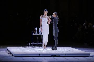 Final du défilé Coperni, Fashion Week Paris : la sculpturale mannequin Bella Hadid (pas loin de 56 milllions de followers sur Instagram) avance en string sur le podium. Une équipe de spécialistes appliquent alors le Spray-on sur son corps pour en faire une robe.