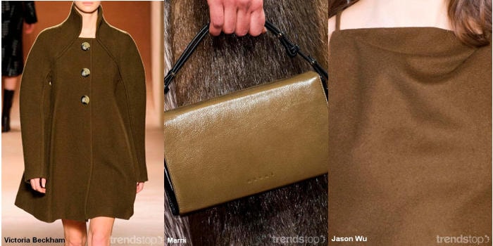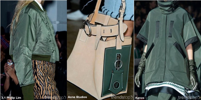 Des transitions de sauge verte fraîche en automne donnant de l’inspiration à une teinte très douce à mi-chemin entre les oliviers et la menthe. Une couleur tendance pour les vêtements d'hiver, les vestes et les manteaux d'inspiration militaire émergent avec des textures satinées et luxueuse ou de matières plus techniques, tandis que le beige contraste avec les sacs à main en daim.