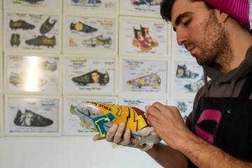 "Parfois, les gens appellent avec une idée spécifique en tête. D'autres fois, ils disent 'je n'ai pas d'idée, faites-moi un beau design'. Alors, on fait tout pour que le client soit satisfait", dit à l'AFP Satja Grabuloski, 31 ans, en préparant des chaussures de foot customisées pour le Brésilien Vinicius Junior, l'ailier star du Real Madrid.