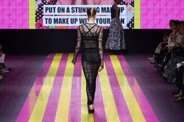 Imaginé par l'artiste italienne Elena Bellantoni et baptisé "Not her" ("Pas elle"), le décor est jaune fluo et fuchsia, couleurs de surligneurs. Il reprend 300 images "sexistes" de la publicité allant des années 40 jusqu'à nos jours et cherche à "inverser les miroirs et changer les règles", explique l'artiste à l'AFP.