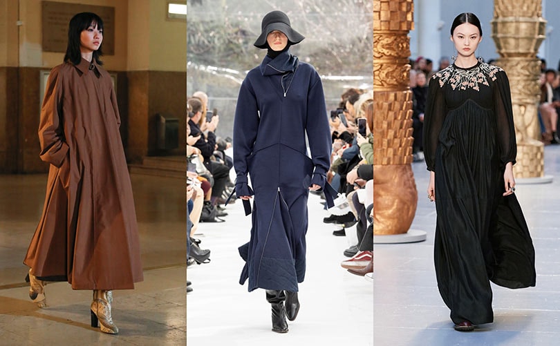 Le métrage des manteaux, jupes et robes s'allonge pour atteindre les chevilles et les pieds. Ce penchant pour le très long est installé depuis quelques saisons déjà et semble se poursuivre au vu des silhouettes longilignes de Lemaire, Kenzo et Chloé.