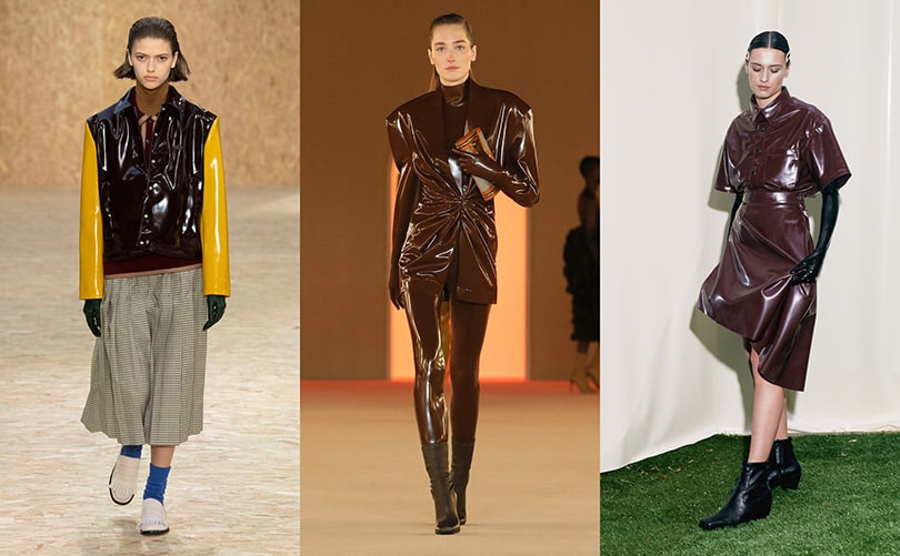 D’ordinaire lié au milieu du sexe, le latex a beaucoup fait parler de lui cette saison après s'être retrouvé en recurrence stylistique au sein des collections Balmain et Saint Laurent. Mais qu’il s’agisse ou non de latex, c’est l’aspect glossy que l’on affectionne particulièrement pour l'automne-hiver prochain. À noter aussi une utilisation généralisée du cuir : grosse pièce d'extérieur, pièce du soir et du vestiaire quotidien.