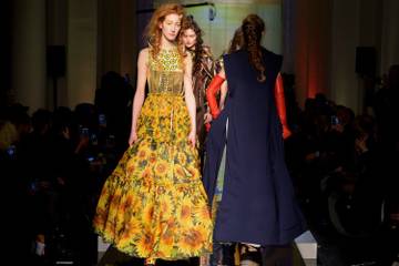 Elles portent des fichus soyeux avec d'élégants tailleurs pantalons. L'inspiration hispanique est présente dans cette collection, avec un boléro à paillettes noir porté sur une brassière à coquelicots et un chapeau rouge. L'univers de la movida n'est pas très loin, avec une jupe de flamenco accompagnée d'un blouson de motard.