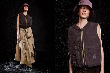 Qu’il s’agisse d’un long trench water résistant à enfiler sur une tenue complète, en cas de pluie, d’un gilet zippé, court sans manches, ou d’un bob muni de l’élastique K-way à attacher sous le menton pour résister au vent, chacune des sept pièces de la collection répond à une fonction précise : protéger hommes et femmes des intempéries, dans une palette de formes contemporaines et coloris naturels.