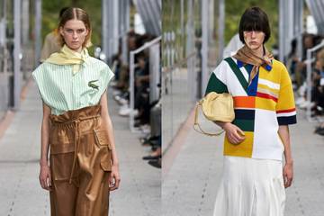 La collection printemps-été est la seconde ligne de la marque dessinée par la directrice artistique britannique Louise Trotter. Aux codes de la maison - jupes plissées, polo et logo crocodile - s’ajoutent des fichus noués autour du cou façon scout et un choix de matières séduisantes, tour à tour compactes, aériennes ou glossy. La palette oscille entre un vert amandes, un jaune citron, du rose dragée et des teintes camels et blanches.
