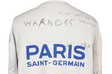 Le club de football a également créé un pull féminin gris, avec la marque contemporaine française Iro, recouvert de mots griffonnés à la main et présentant un logo Paris Saint-Germain sur le dos.