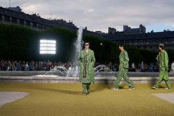 Présenté mercredi soir au célèbre Palais-Royal, le défilé s’est ouvert sur une enchaînement de pièces sportives et ajustées arborant des imprimés de feuilles et de palmiers dans différentes nuances de vert. Des hauts en tricot vibrants, certains ornés d’étoiles de mer, suivis d'éléments en soie dans une teinte prune profonde. D’autres imprimés dans des tons effervescents de bleu, de jaune et de corail (ce dernier apparaissant dans les modèles de vêtements pour femmes) étaient peut-être un peu trop vibrants, même venant de Nigo, designer connu pour son style urbain. En termes de chaussures, la sandale japonaise traditionnelle était associée à une semelle compensée.