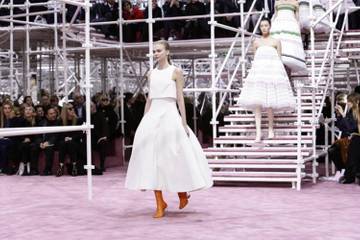 La robe à taille cintrée et à fleurs chère à Christian Dior est là mais elle s'accompagne de cuissardes de couleurs flashy : sur la musique de David Bowie, Raf Simons a convoqué avec audace les décennies 1950, 60 et 70 dans sa collection haute couture. Le couturier belge, qui avait dans ses précédents défilés revisité avec un oeil futuriste le XVIIIe siècle, renoue encore une fois avec une esthétique très science-fiction, sous un chapiteau tapissé de miroirs et d'échafaudages, à effet kaléidoscopique, installé dans le jardin du Musée Rodin à Paris. Egérie de Dior, l'actrice Natalie Portman et son mari le chorégraphe Benjamin Millepied avaient pris place au premier rang, non loin des actrices Clotilde Courau et Marisa Berenson.