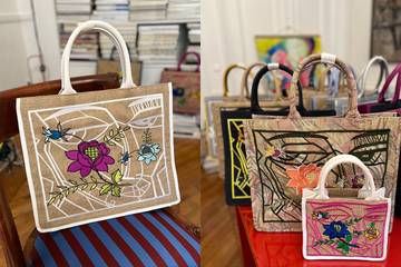 À la base, Nadia Chellaoui est une artiste peintre inspirée par le cubisme et les couleurs chatoyantes. Elle a ensuite l’idée d’apposer sur des toiles de jute des broderies inspirées de ses œuvres et de les monter en cabas, avec bords et poignets en cuir. Le tout fait main dans la tradition artisanale propre à ce pays d’Afrique du nord. Ce travail d’excellence lui permet de se faire très vite remarquer sur la scène mode et c’est Paris qu’elle choisit comme capitale pour exposer ses « œuvres d’art transportables ».