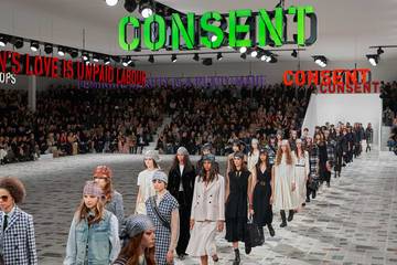 "Consent" (consentement) a clignoté tout au long du défilé à l'esprit seventies mais avec des proportions modernes devant un parterre de célébrités parmi lesquelles les actrices Demi Moore, Andy McDowell, Sigourney Weaver, l'avocate nicaraguayenne Bianca Jagger, les tops Cara Delavingne et Karlie Kloss, la chanteuse et ex-Première dame de France Carla Bruni.