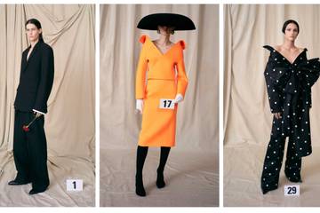 Le show s’est ouvert sur un tailleur noir suivi d’une variation de silhouettes tailoring, toujours dans cette même teinte sombre chère à Cristobal Balenciaga. On note plus loin une robe de cocktail à col montant et sans manches, un ensemble jaune dont la veste reprend ce mouvement « basculé en arrière », en référence à la façon dont le fondateur travaillait lui-même ses profils et qui contribua à son succès. Plusieurs looks reprennent cette ligne, déjà présente chez Demna Gvasalia dans les collections prêt-à-porter de la maison.