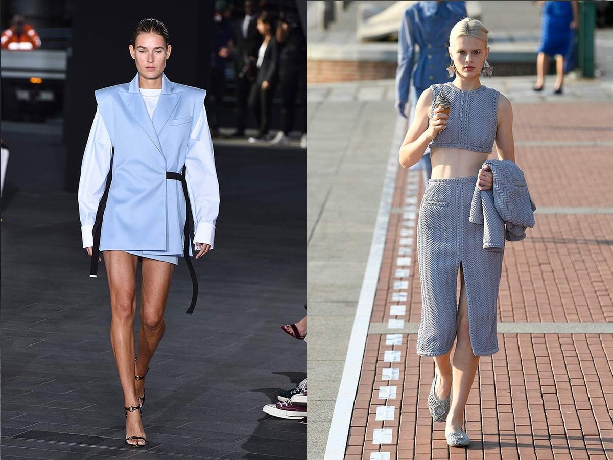 « Un bleu identifiable et sûr pour le confort et la praticité », telle est la description que donne Pantone au « Faded Denim ». Une tendance de couleur convaincante, puisque nous voyons en effet des teintes de bleu clair s'assortir à une nuance de denim blanchie dans de nombreuses collections, dont Salvatore Ferragamo, David Koma, Marco de Vincenzo, Sportmax, Bottega Veneta et Annakiki. La couleur est également visible dans les looks monochromes de David Koma, également associée à l'orange.