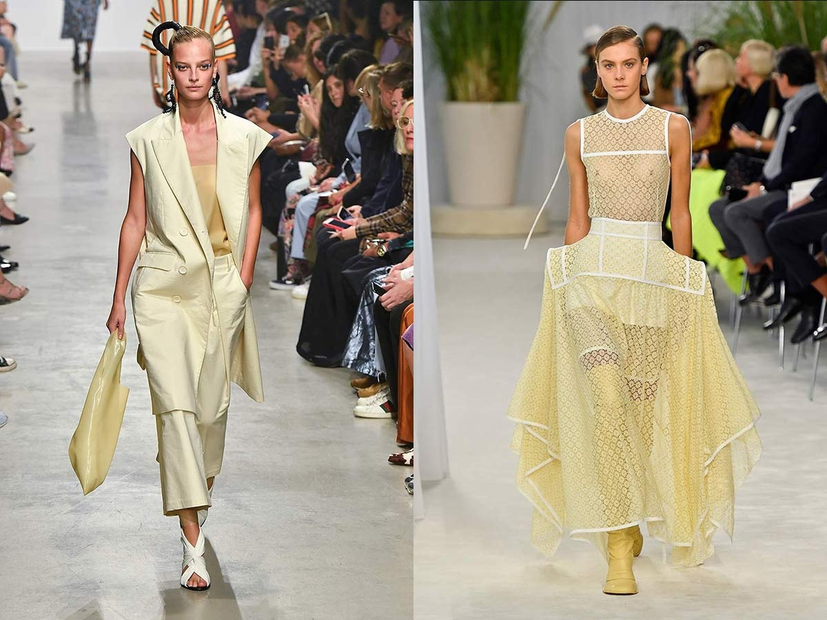 Selon les maisons de couture, la teinte Sunlight est un jaune plus polyvalent qui peut être adapté à une tenue professionnelle comme décontractée. Cette saison, de nombreux designers ont appliqué cette couleur en total look. Christian Wijnants, Jil Sander et Proenza Schouler présentent une variété de costumes pour femmes dans un jaune doux et joyeux. Nous repérons également la couleur sur une robe en dentelle signée Loewe et des variantes romantiques chez Nina Ricci par Rushemy Botter et Lisi Herrebrugh, chez JW Anderson et chez Christian Wijnants.