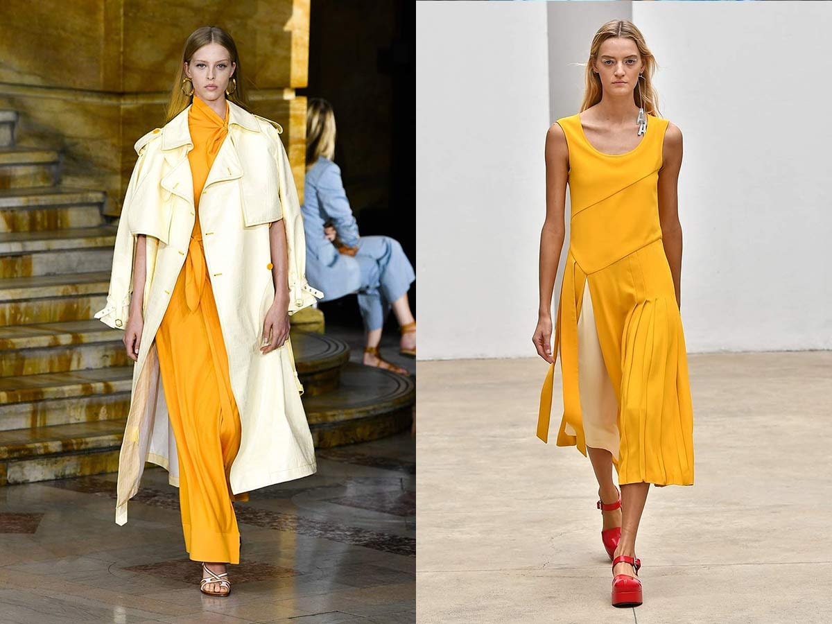 Le jaune maintient sa présence sur les podiums. Selon Pantone, le jaune moutarde (safran) et le doux jaune pastel (soleil) seront deux des couleurs favorites de ce printemps-été 2020. Les collections de Sies Marjan et Arthur Arbesser combinent les deux teintes jaunes pour un look vif et accrocheur.