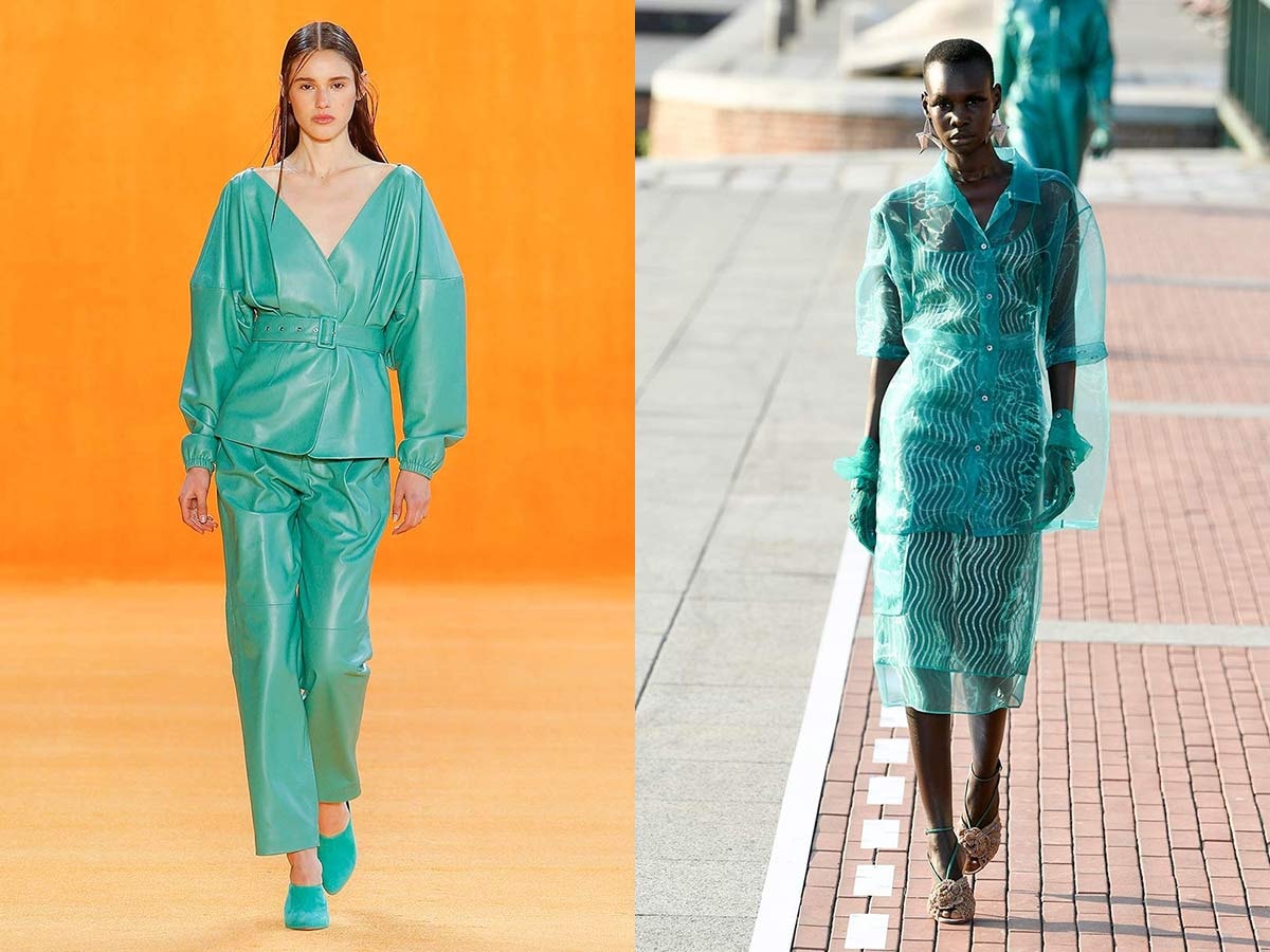 Une nuance aquatique « cool et rafraîchissante ». Sally Lapointe, Marco de Vincenzo et Vivetta présentent des tenues pensées entièrement dans cette couleur. Nous repérons également cette teinte rafraîchissante chez Gucci, associée à du kaki chez Agnona et Stella McCartney.