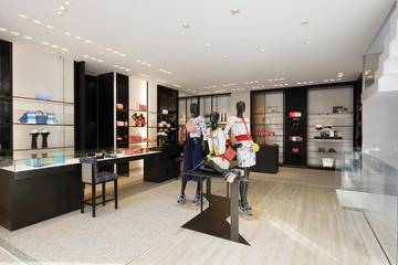 Indépendantes au rez-de-chaussée, les deux boutiques se rejoignent à l’étage : chacune est dotée d’un ascenseur plaqué de miroirs et de maille métallique dorée desservant un niveau supérieur commun. Un escalier suspendu magistral, en marbre blanc, accessible seulement depuis la boutique mode, y mène également. Les deux univers sont cependant clairement distingués par une séparation qui prend la forme d’un couloir parqueté noir décoré de quatre lithographies d'Agnès Martin.