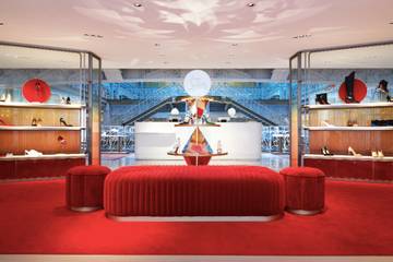 Situé au quatrième étage, l’espace de 28 mètres carrés rend hommage à la première boutique de Christian Louboutin dont les arches cernées de laiton ont inspiré la forme des miroirs du corner. Délimité par quatre cloisons en verre fumé, il se distingue par une luminosité traversante qui vient souligner l’omniprésence de la couleur signature de la maison : le rouge. Les collections de souliers pour femme y seront proposées, aux côtés d’une sélection de maroquinerie. Un espace qui s’ajoute aux 160 points de vente Christian Louboutin dans le monde.