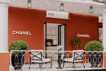 La boutique à l’architecture italienne s’ouvre sur une large terrasse en pierre et des murs couleur terracotta. Cette année, Chanel opte pour une décoration intérieure à l’esprit minimaliste et épuré. L’espace baigne dans une lumière claire et diffuse qui contraste avec des détails graphiques noirs, notamment présents sur les cadres et miroirs de la boutique.