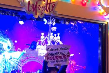 « Galeries Lafayette : Bannissez la fourrure de vos magasins ! » pouvait-on lire, en français et en anglais, sur le panneau brandi devant l’une des vitrines. Mais pourquoi s’en prendre précisément aux Galeries Lafayette ?