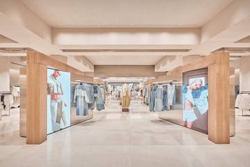 2 700 mètres carrés d’espace commercial sur un seul niveau, tout en longueur, le lieu, imaginé par le studio d’architecture de Zara, est conçu tel une promenade où les collections se succèdent. L’ambiance voulue est minimaliste et zen tranchant, par là même, avec le flot des collections que suggèrent la fast fashion : murs, portants et cubes en marbre beige, tables en bois et coloris neutres (beiges, nude, gris, blanc).