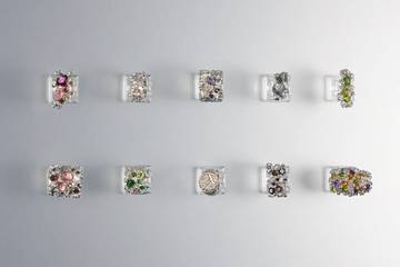 Chacune des cages, conçues par Rei Kawakubo pour Dover Street Market*, présente les bijoux d’un créateur. En l’occurrence, Alabaster Industries, Antoine Labourel, CdG Jewellery, Comme des Garçons X Mikimoto, Meteor, Spinelli Kilcollin, Tant D’Avenir, Zoe Mohm.