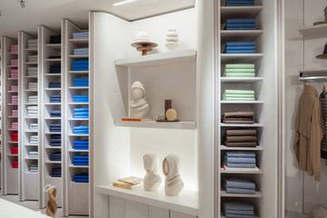 À travers des matériaux nobles - sol en pierre trouvée en Italie, bois, tissu bouclette dans les cabines qui évoque le cachemire – et des tonalités neutres – beige, blanc cassé -, l’aménagement intérieur de la boutique, s’inscrit dans cette transformation souhaitée, tout en conservant l’esprit douillet et moelleux du cachemire.