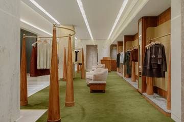 Yves Salomon propose à sa clientèle londonienne de découvrir ses produits dans un espace de 60 mètres carrés, situé au premier étage du célèbre grand magasin Harrods. Il a été pensé comme une véritable « bulle de calme », un havre de paix naturel bien loin de la frénésie et du dynamisme de la ville. Pour l’occasion, la marque mise sur des tonalités chaudes, créant l’impression d’entrer dans un jardin botanique avec sa moquette verte et ses meubles organiques en bois naturel.