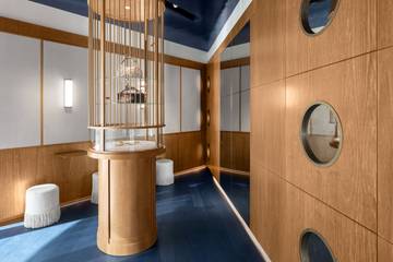 Mais la référence la plus marquée est sans nul doute celle au défilé Jeanne Lanvin Haute Couture 1935, qui s’est déroulé lors de la traversée inaugurale du paquebot « Normandie. » La boutique offre une expérience immersive grâce à son allure de point de vente flottant. Cet effet résulte d’une scénographie et décoration particulièrement soignées, comprenant notamment des meubles en bois aux lignes ondulées, des vitrines en forme de fenêtres circulaires, le tout dans un nuancier de couleurs composé de blanc, bleu et brun (qui n’est pas sans rappeler la mer).