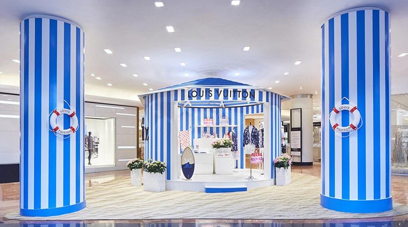 Jusqu'au 30 juin, Louis Vuitton expose cette collection estivale baptisée LV Escale dans un pop-up store aux couleurs de parasol. Sur un sol marbré de sable, des rayures blanches et bleues habillent un petit chapiteau de plage entouré de bacs à fleurs. Le maroquinier plonge les visiteurs parisiens dans l'ambiance des vacances d’été.