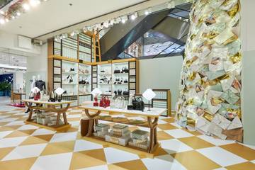 Au centre de l’atrium, les produits sont exposés sur des tables de lecture de bibliothèque et éclairés par des lampes rétro aux abat-jours triangulaires en papier. Le pop-up présente une sélection spéciale de prêt-à-porter féminin, de sacs, d'accessoires et d'idées-cadeaux. Le noir et le blanc dominent l’offre de prêt-à-porter avec quelques touches métalliques. Parmi les idées-cadeaux, Prada propose de la vaisselle et d'objets de décoration pour la maison et des jeux de cartes, entre autres.