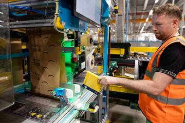 Grâce à un capteur intégré, des machines scannent les produits, qu’il s’agisse de jeux vidéo, équipements de sport, fournitures de bureau ou ustensiles de cuisine, auparavant expédiés dans des cartons ou des enveloppes cartonnées, pour calculer le volume de papier nécessaire pour emballer en toute sécurité.