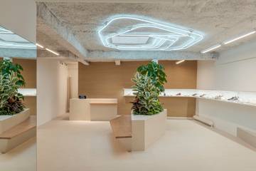 Cette nouvelle adresse associe innovations et matériaux écologiques. Certains murs sont enduits de terre excavée, extraite de chantiers du Grand Paris. Enfn, à l’instar des autres lieux de la marque, la sculpture en néon de l’artiste brésilien Kleber Matheus habille le magasin tandis que l’éclairage est alimenté par Enercoop, une coopérative française d’énergie renouvelable.