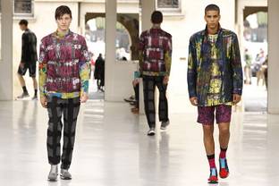 Foulard long flottant autour du cou, pantalons laissant apparaître des chaussettes à motifs géométriques, chaussures de sport: Issey Miyake a présenté un homme à l'élégance confortable, aux accents écossais, jeudi au deuxième jour des défilés de mode masculine à Paris. La soie, japonaise est à l'honneur dans le vestiaire proposé pour...
